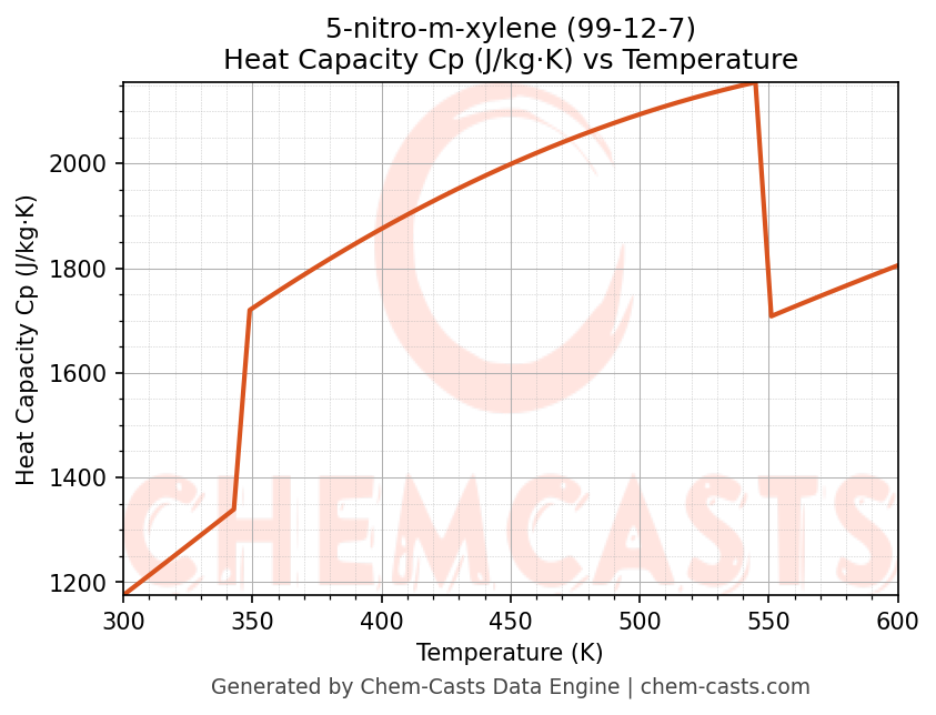 - Specific heat capacity (Cp) indicates the amount of energy required to raise the temperature of 5-nitro-m-xylene and is critical for energy balance and heat-exchanger design.