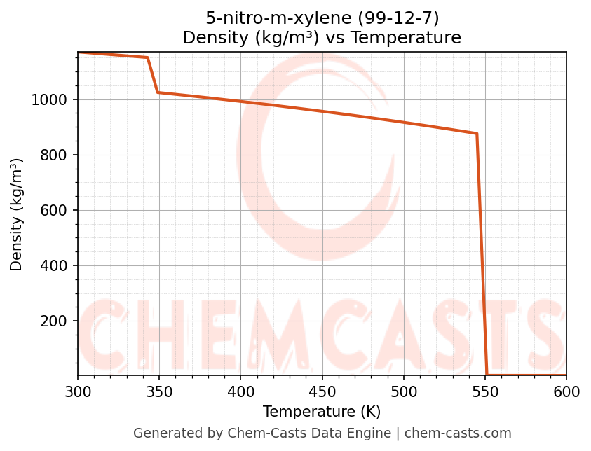 This page presents the temperature-dependent thermodynamic and transport properties of 5-nitro-m-xylene (CAS 99-12-7) calculated at a constant pressure of 1 atm (101325 Pa) over the temperature range 250-500 K.