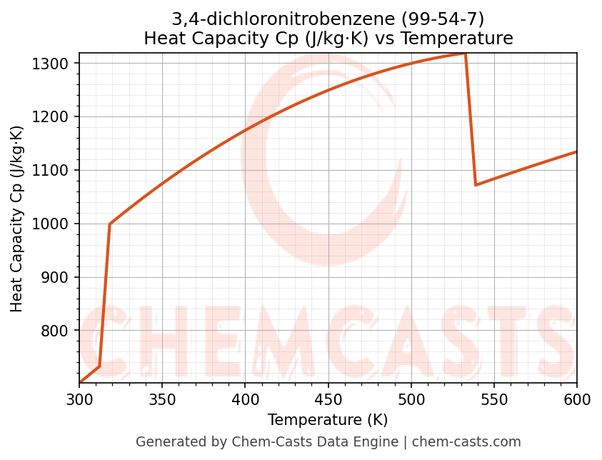 - Specific heat capacity (Cp) indicates the amount of energy required to raise the temperature of 3,4-dichloronitrobenzene and is critical for energy balance and heat-exchanger design.