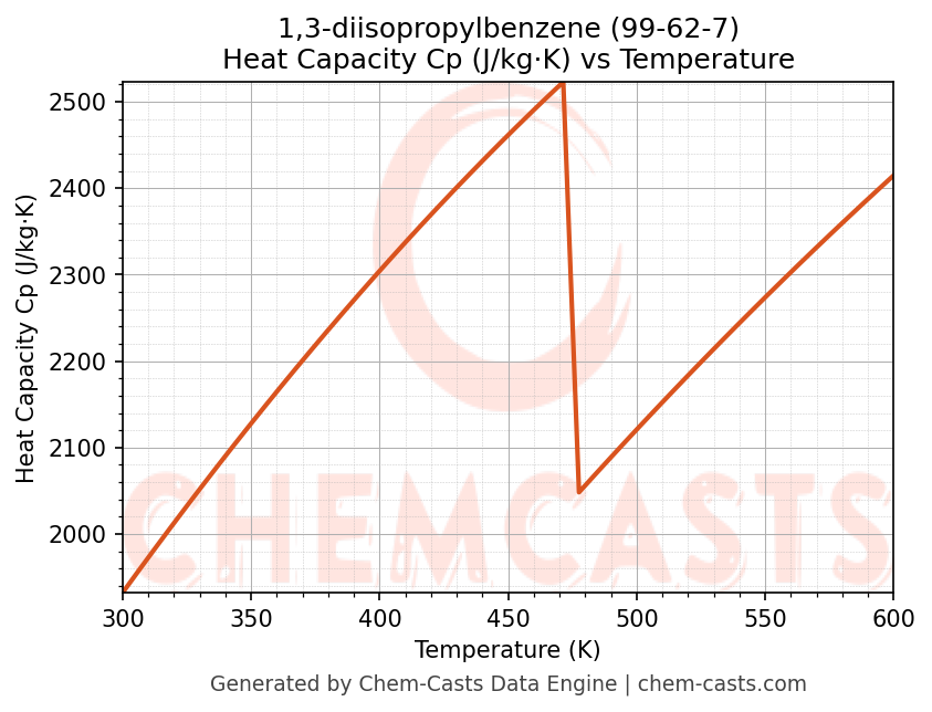 - Specific heat capacity (Cp) indicates the amount of energy required to raise the temperature of 1,3-diisopropylbenzene and is critical for energy balance and heat-exchanger design.