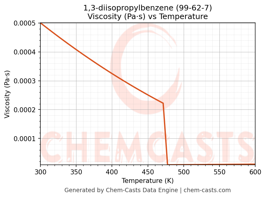 This page presents the temperature-dependent thermodynamic and transport properties of 1,3-diisopropylbenzene (CAS 99-62-7) calculated at a constant pressure of 1 atm (101325 Pa) over the temperature range 250-500 K.