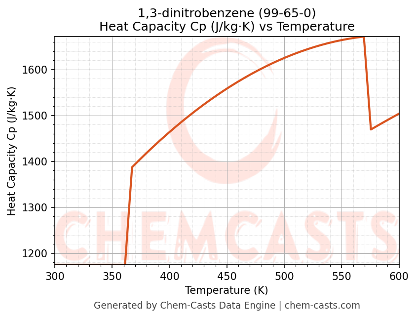 - Specific heat capacity (Cp) indicates the amount of energy required to raise the temperature of 1,3-dinitrobenzene and is critical for energy balance and heat-exchanger design.