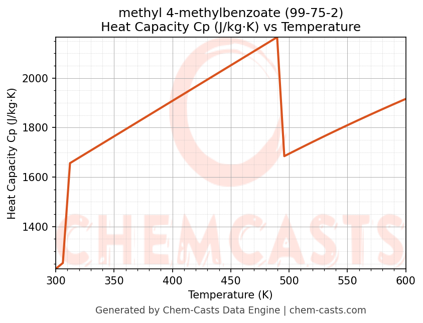 - Specific heat capacity (Cp) indicates the amount of energy required to raise the temperature of methyl 4-methylbenzoate and is critical for energy balance and heat-exchanger design.