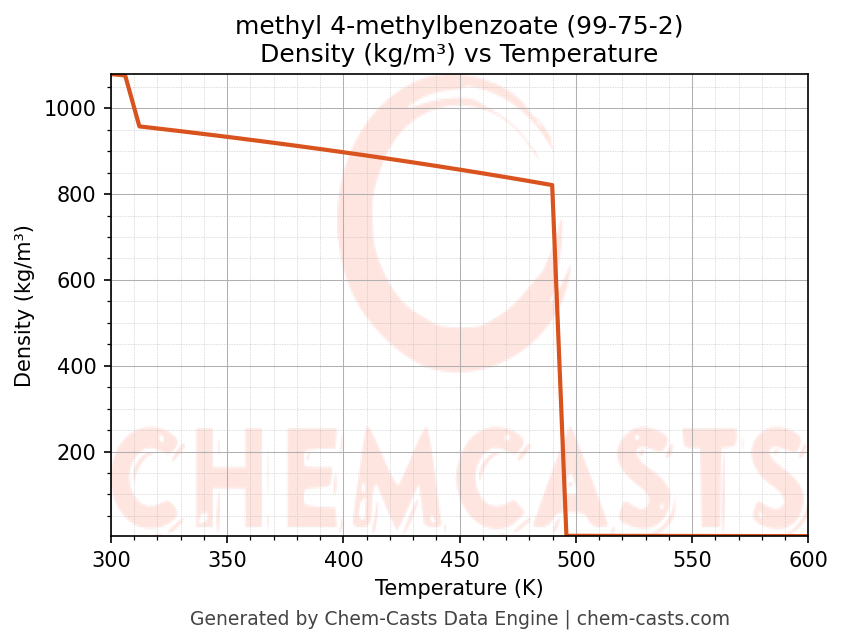 This page presents the temperature-dependent thermodynamic and transport properties of methyl 4-methylbenzoate (CAS 99-75-2) calculated at a constant pressure of 1 atm (101325 Pa) over the temperature range 250-500 K.