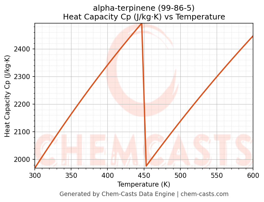 - Specific heat capacity (Cp) indicates the amount of energy required to raise the temperature of alpha-terpinene and is critical for energy balance and heat-exchanger design.