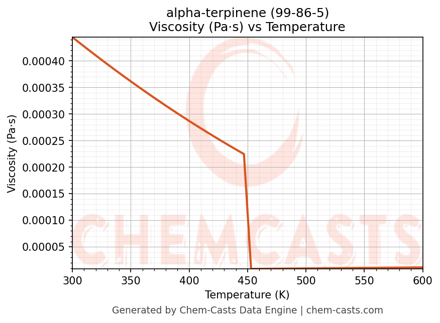 This page presents the temperature-dependent thermodynamic and transport properties of alpha-terpinene (CAS 99-86-5) calculated at a constant pressure of 1 atm (101325 Pa) over the temperature range 250-500 K.