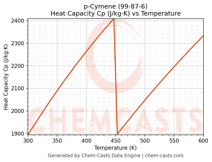 - Specific heat capacity (Cp) indicates the amount of energy required to raise the temperature of p-Cymene and is critical for energy balance and heat-exchanger design.