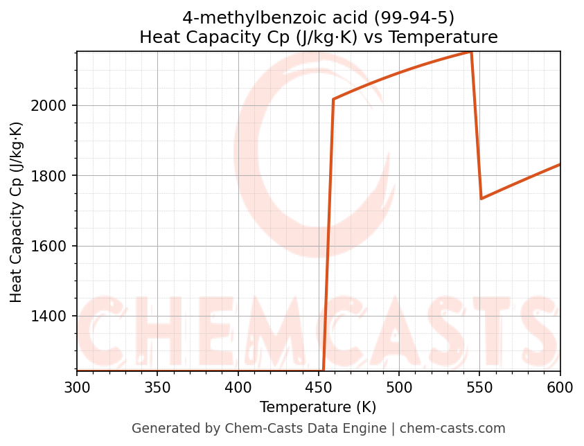 - Specific heat capacity (Cp) indicates the amount of energy required to raise the temperature of 4-methylbenzoic acid and is critical for energy balance and heat-exchanger design.