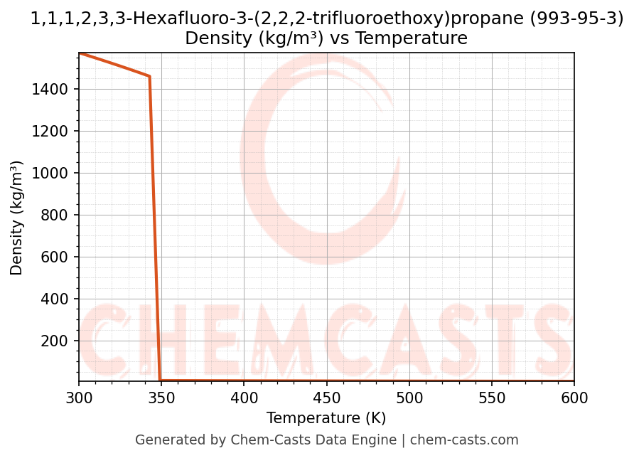 This page presents the temperature-dependent thermodynamic and transport properties of 1,1,1,2,3,3-Hexafluoro-3-(2,2,2-trifluoroethoxy)propane (CAS 993-95-3) calculated at a constant pressure of 1 atm (101325 Pa) over the temperature range 250-500 K.