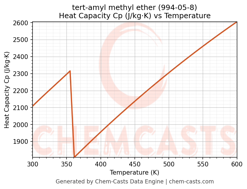 - Specific heat capacity (Cp) indicates the amount of energy required to raise the temperature of tert-amyl methyl ether and is critical for energy balance and heat-exchanger design.