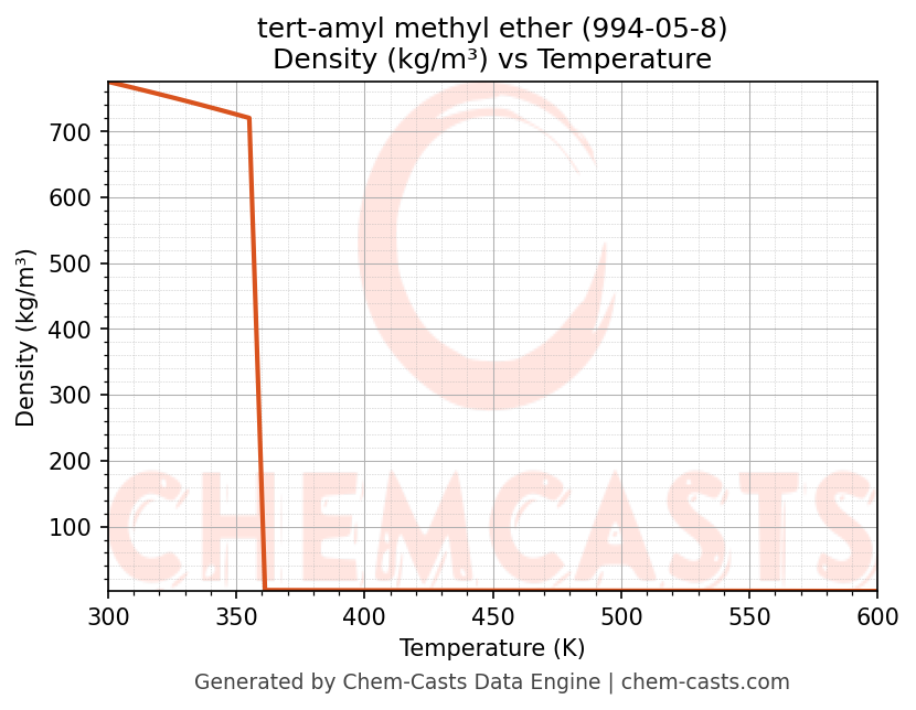 This page presents the temperature-dependent thermodynamic and transport properties of tert-amyl methyl ether (CAS 994-05-8) calculated at a constant pressure of 1 atm (101325 Pa) over the temperature range 250-500 K.