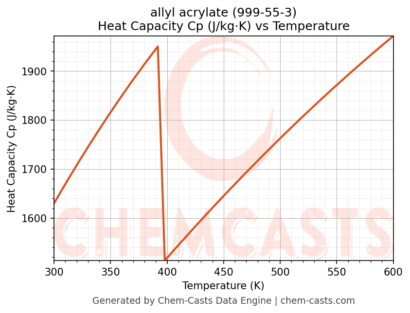 - Specific heat capacity (Cp) indicates the amount of energy required to raise the temperature of allyl acrylate and is critical for energy balance and heat-exchanger design.