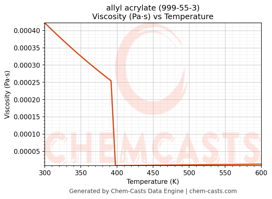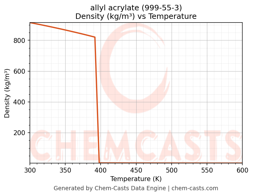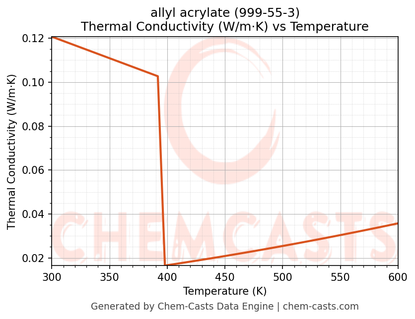This page presents the temperature-dependent thermodynamic and transport properties of allyl acrylate (CAS 999-55-3) calculated at a constant pressure of 1 atm (101325 Pa) over the temperature range 250-500 K.