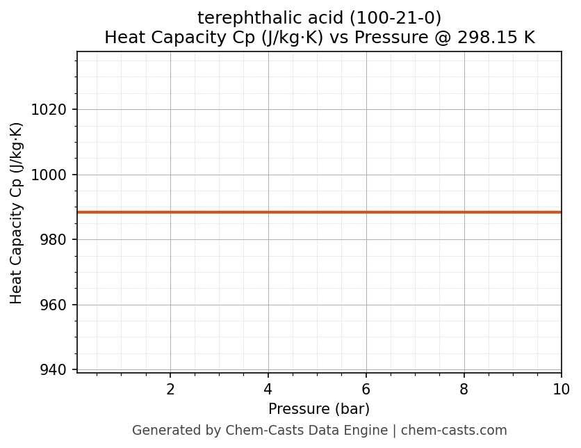 This page presents the pressure-dependent thermodynamic and transport properties of terephthalic acid (CAS 100-21-0) calculated at a constant temperature of 298 K (25 °C) over the pressure range 0.10-10 bar.