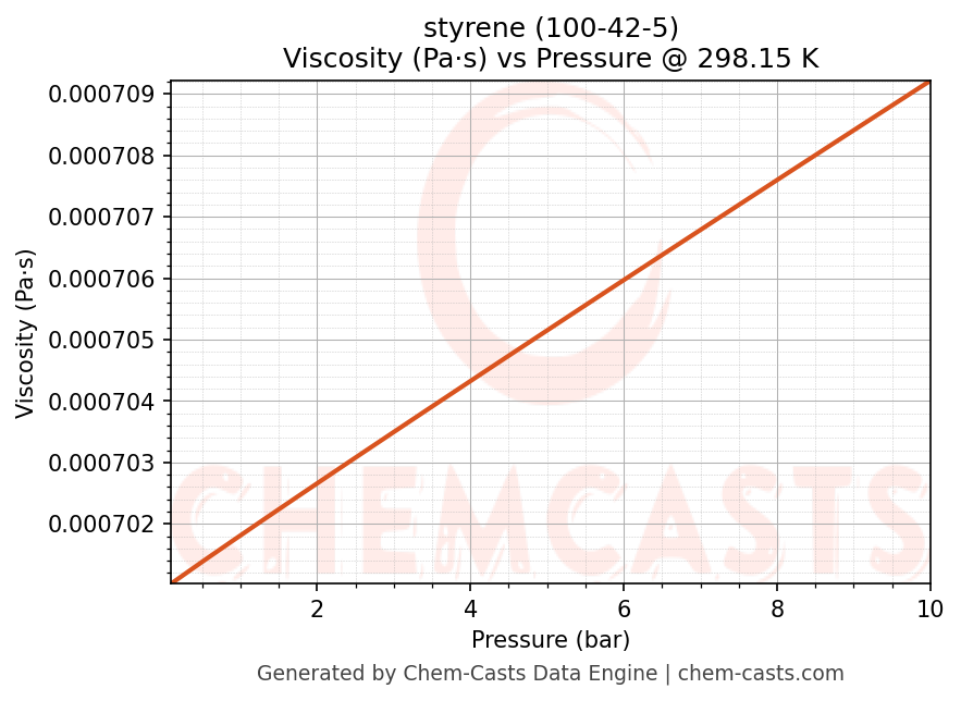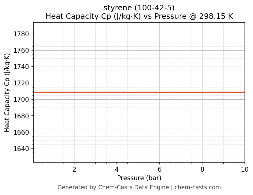 This page presents the pressure-dependent thermodynamic and transport properties of styrene (CAS 100-42-5) calculated at a constant temperature of 298 K (25 °C) over the pressure range 0.10-10 bar.