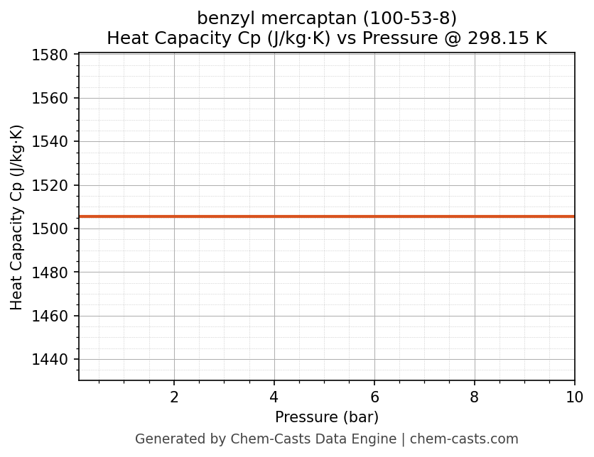 This page presents the pressure-dependent thermodynamic and transport properties of benzyl mercaptan (CAS 100-53-8) calculated at a constant temperature of 298 K (25 °C) over the pressure range 0.10-10 bar.
