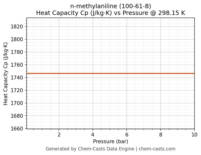 This page presents the pressure-dependent thermodynamic and transport properties of n-methylaniline (CAS 100-61-8) calculated at a constant temperature of 298 K (25 °C) over the pressure range 0.10-10 bar.