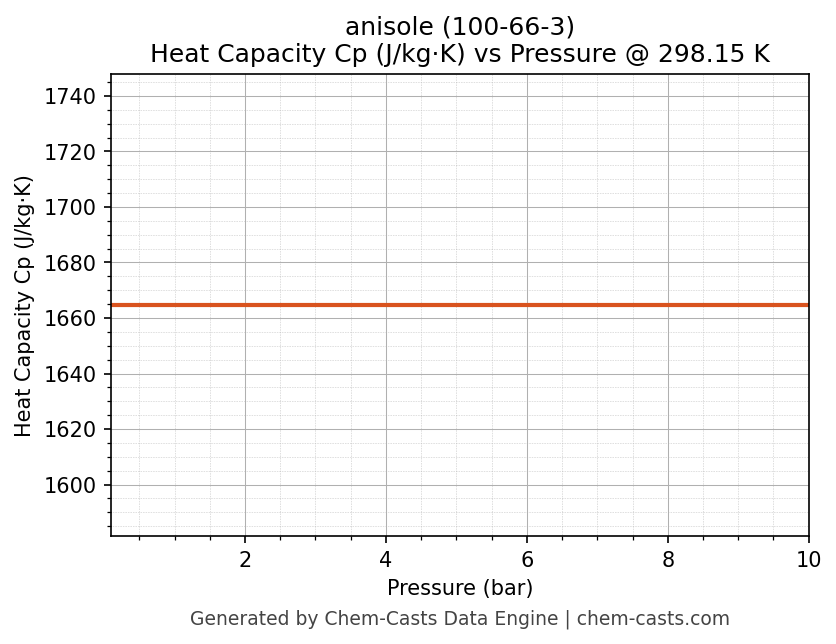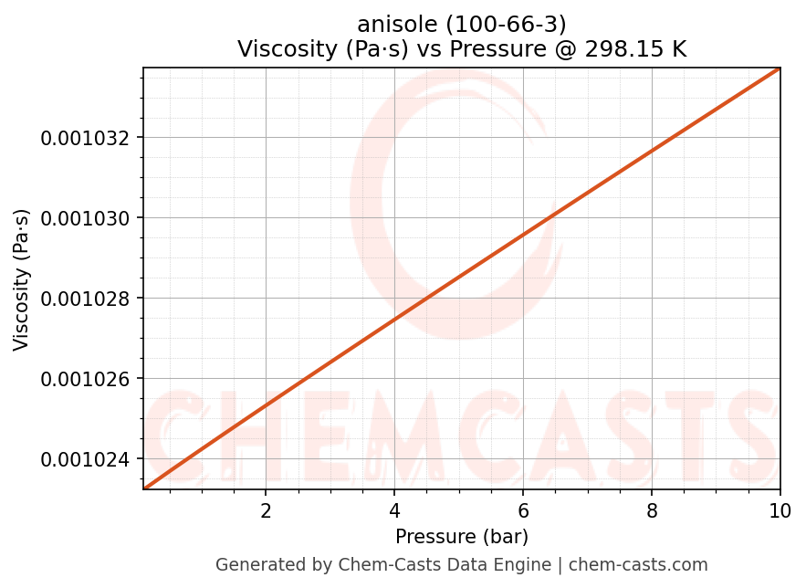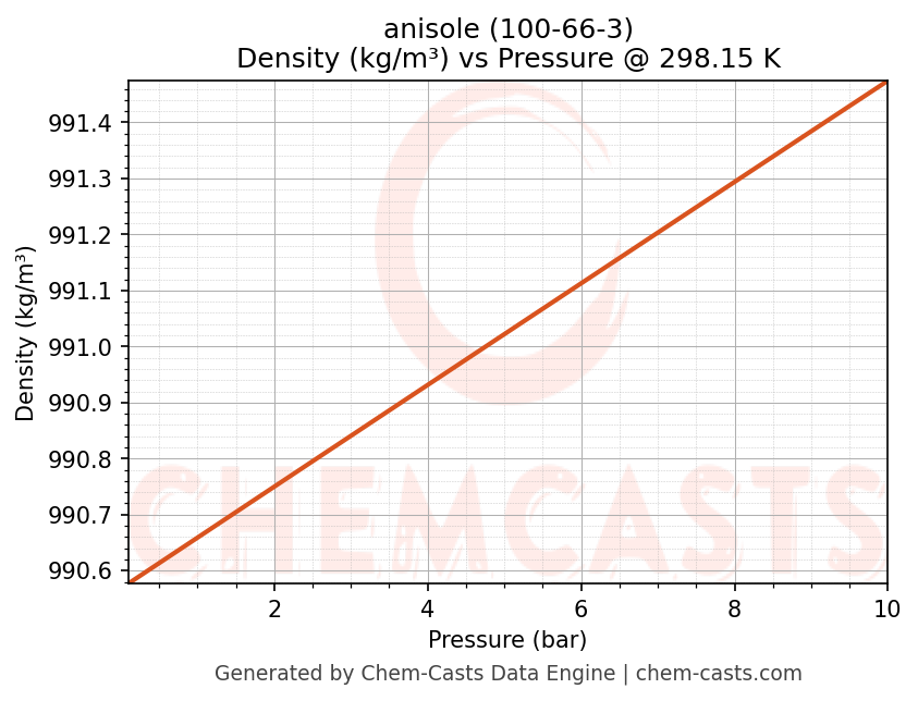 This page presents the pressure-dependent thermodynamic and transport properties of anisole (CAS 100-66-3) calculated at a constant temperature of 298 K (25 °C) over the pressure range 0.10-10 bar.