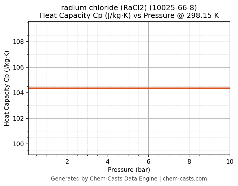 This page presents the pressure-dependent thermodynamic and transport properties of radium chloride (RaCl2) (CAS 10025-66-8) calculated at a constant temperature of 298 K (25 °C) over the pressure range 0.10-10 bar.