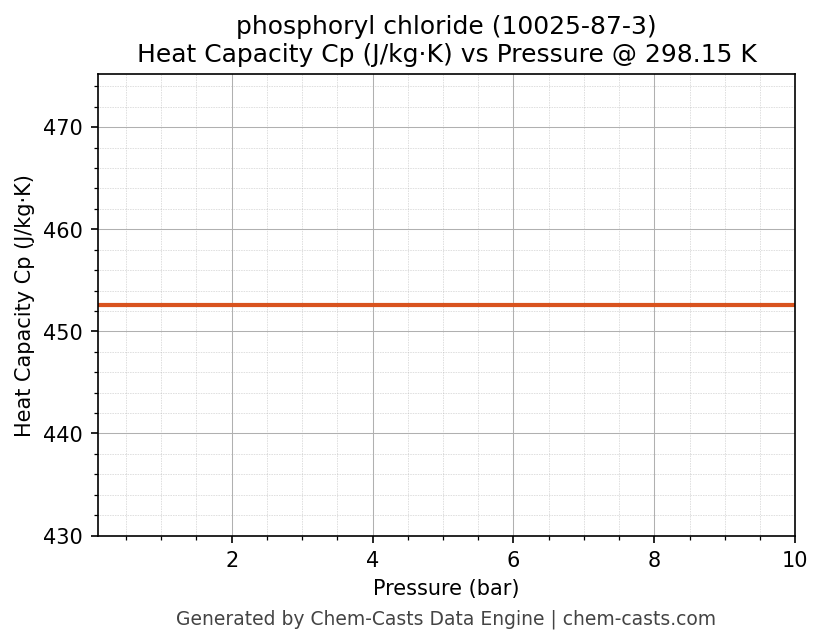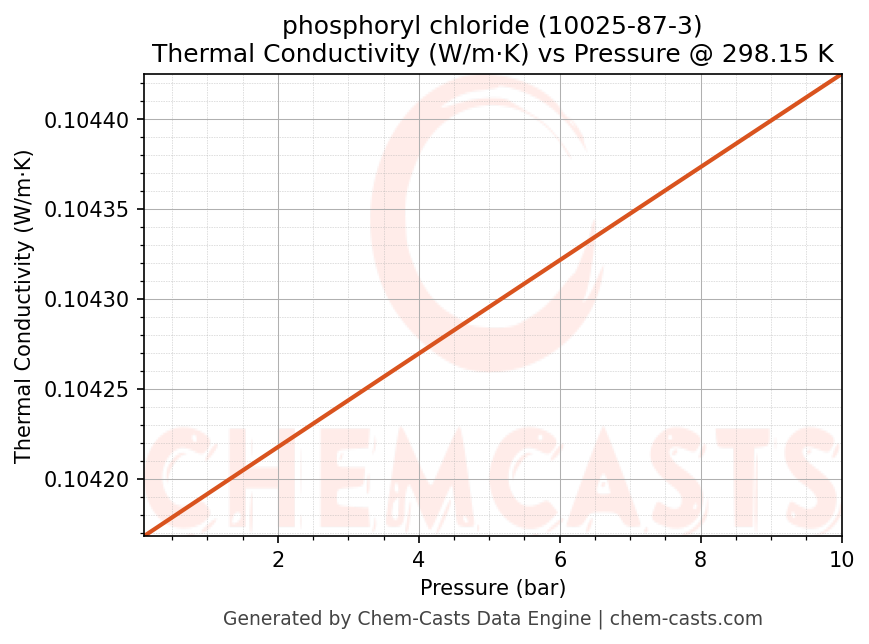This page presents the pressure-dependent thermodynamic and transport properties of phosphoryl chloride (CAS 10025-87-3) calculated at a constant temperature of 298 K (25 °C) over the pressure range 0.10-10 bar.