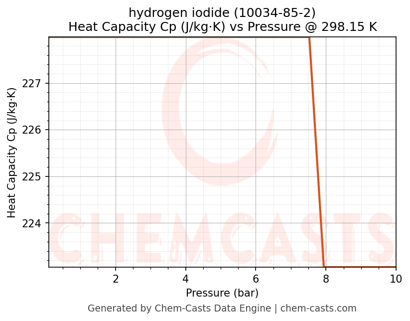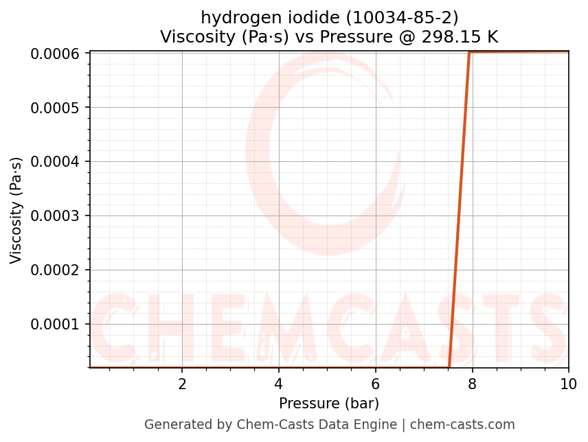 This page presents the pressure-dependent thermodynamic and transport properties of hydrogen iodide (CAS 10034-85-2) calculated at a constant temperature of 298 K (25 °C) over the pressure range 0.10-10 bar.