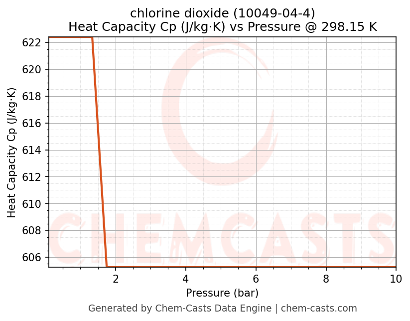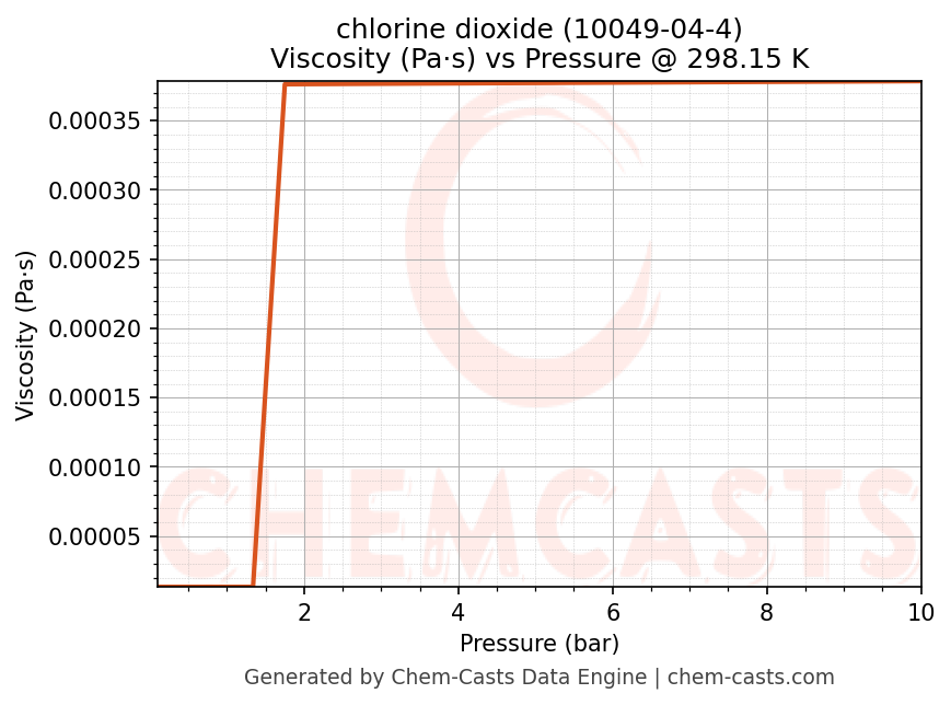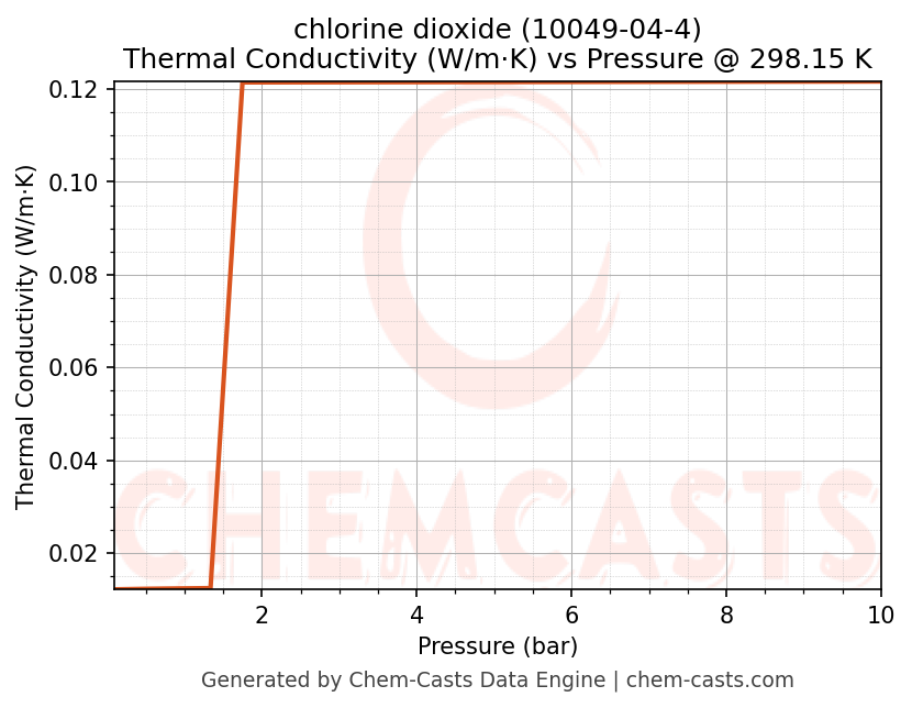 This page presents the pressure-dependent thermodynamic and transport properties of chlorine dioxide (CAS 10049-04-4) calculated at a constant temperature of 298 K (25 °C) over the pressure range 0.10-10 bar.