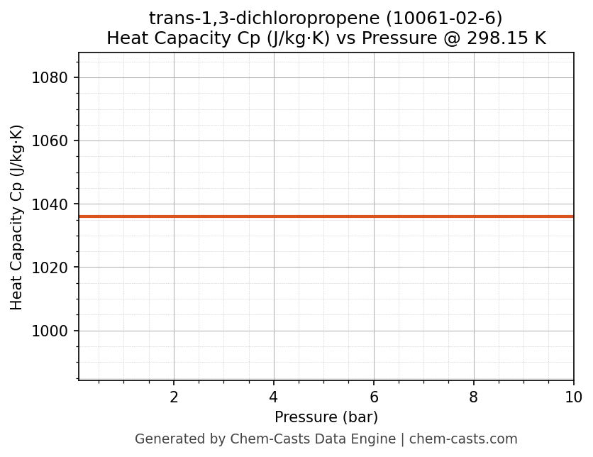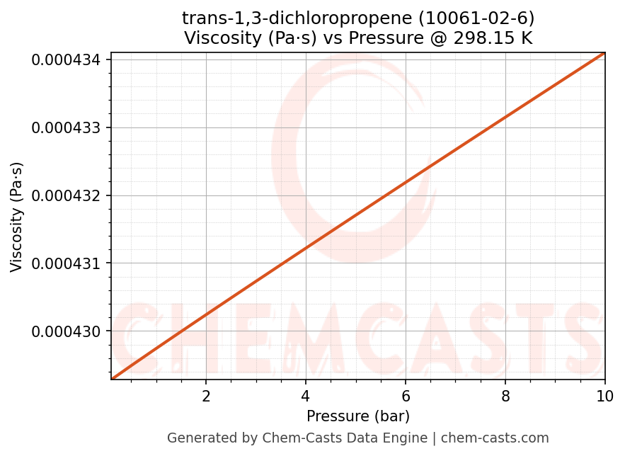 This page presents the pressure-dependent thermodynamic and transport properties of trans-1,3-dichloropropene (CAS 10061-02-6) calculated at a constant temperature of 298 K (25 °C) over the pressure range 0.10-10 bar.