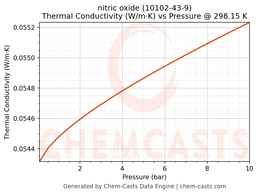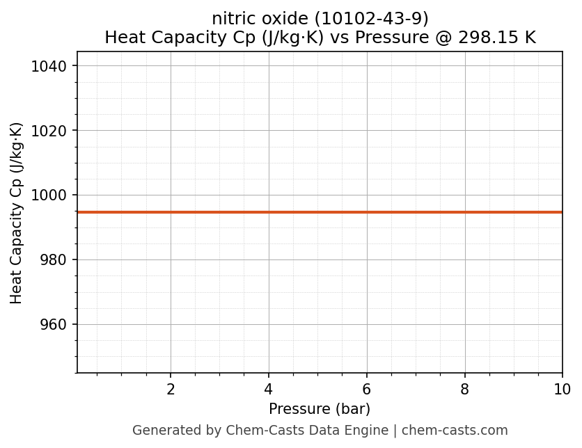 This page presents the pressure-dependent thermodynamic and transport properties of nitric oxide (CAS 10102-43-9) calculated at a constant temperature of 298 K (25 °C) over the pressure range 0.10-10 bar.