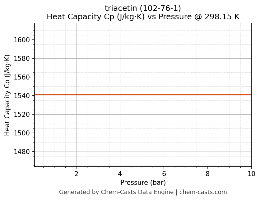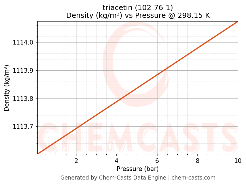 This page presents the pressure-dependent thermodynamic and transport properties of triacetin (CAS 102-76-1) calculated at a constant temperature of 298 K (25 °C) over the pressure range 0.10-10 bar.