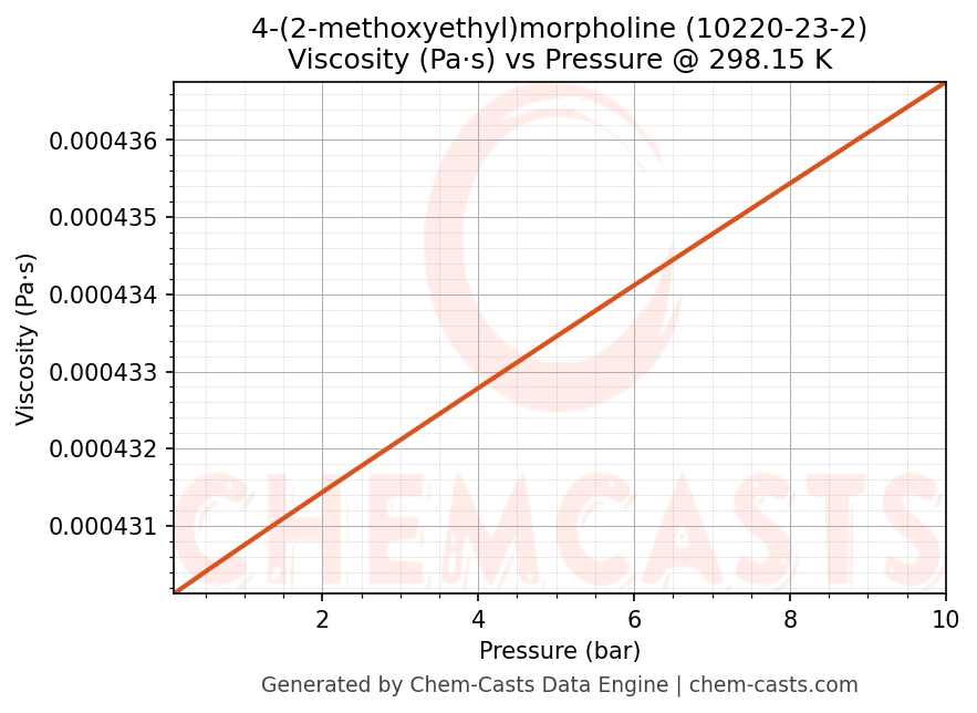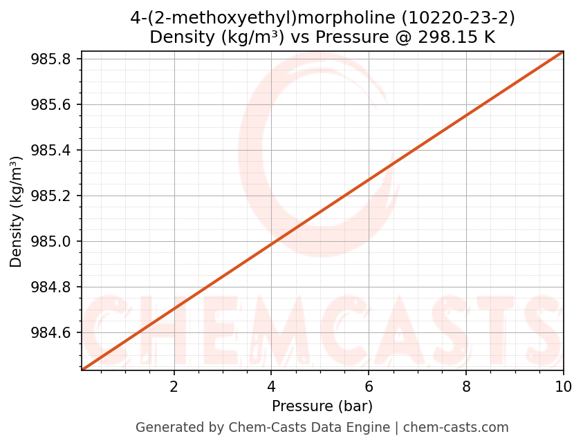 This page presents the pressure-dependent thermodynamic and transport properties of 4-(2-methoxyethyl)morpholine (CAS 10220-23-2) calculated at a constant temperature of 298 K (25 °C) over the pressure range 0.10-10 bar.