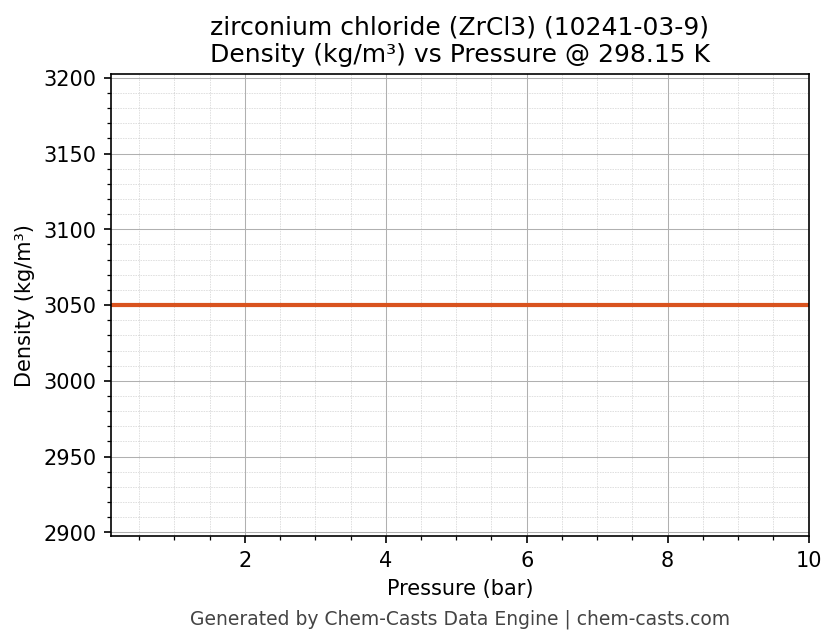 This page presents the pressure-dependent thermodynamic and transport properties of zirconium chloride (ZrCl3) (CAS 10241-03-9) calculated at a constant temperature of 298 K (25 °C) over the pressure range 0.10-10 bar.
