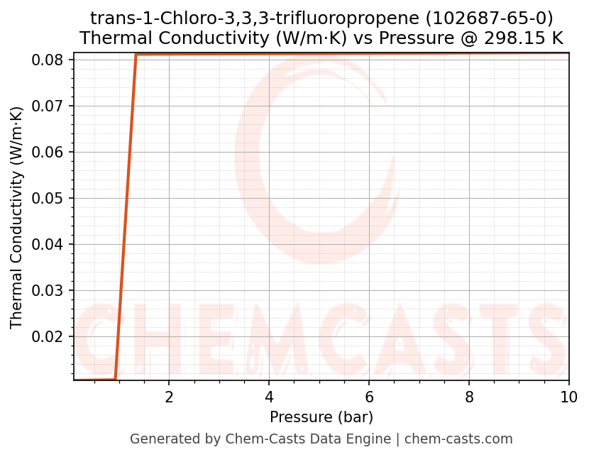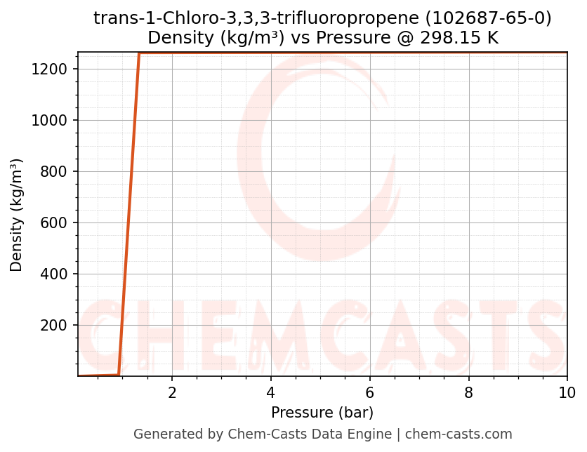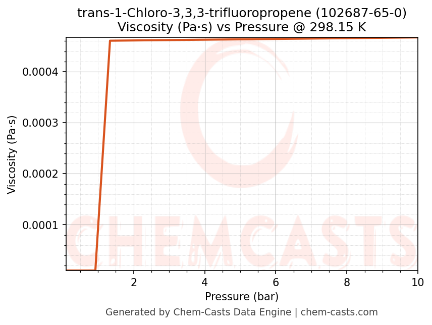 This page presents the pressure-dependent thermodynamic and transport properties of trans-1-Chloro-3,3,3-trifluoropropene (CAS 102687-65-0) calculated at a constant temperature of 298 K (25 °C) over the pressure range 0.10-10 bar.