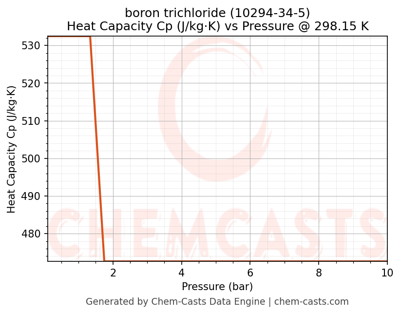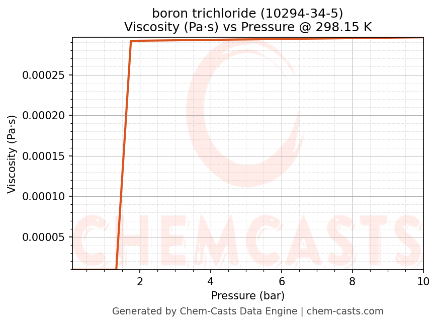 This page presents the pressure-dependent thermodynamic and transport properties of boron trichloride (CAS 10294-34-5) calculated at a constant temperature of 298 K (25 °C) over the pressure range 0.10-10 bar.