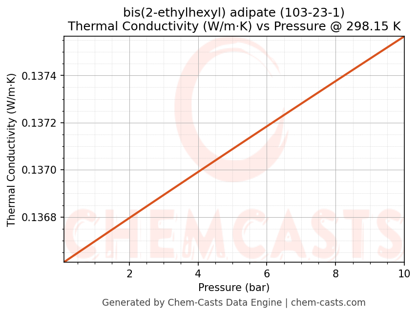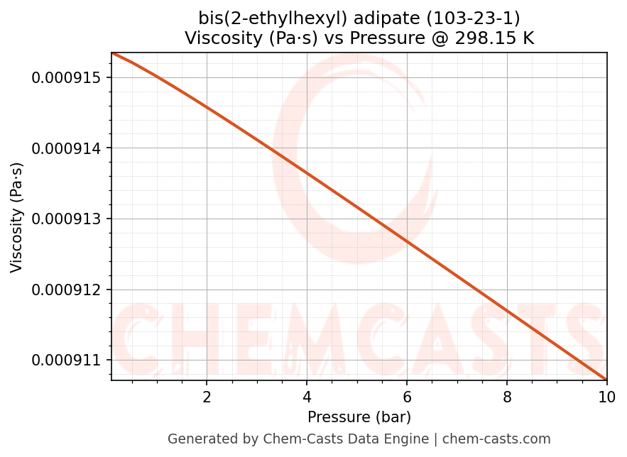 This page presents the pressure-dependent thermodynamic and transport properties of bis(2-ethylhexyl) adipate (CAS 103-23-1) calculated at a constant temperature of 298 K (25 °C) over the pressure range 0.10-10 bar.