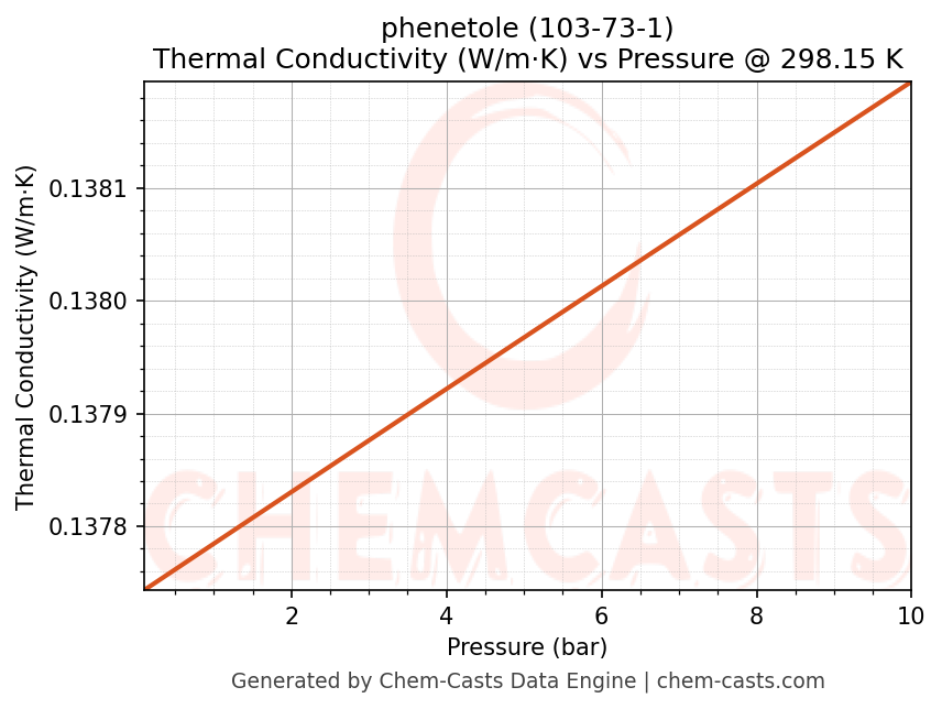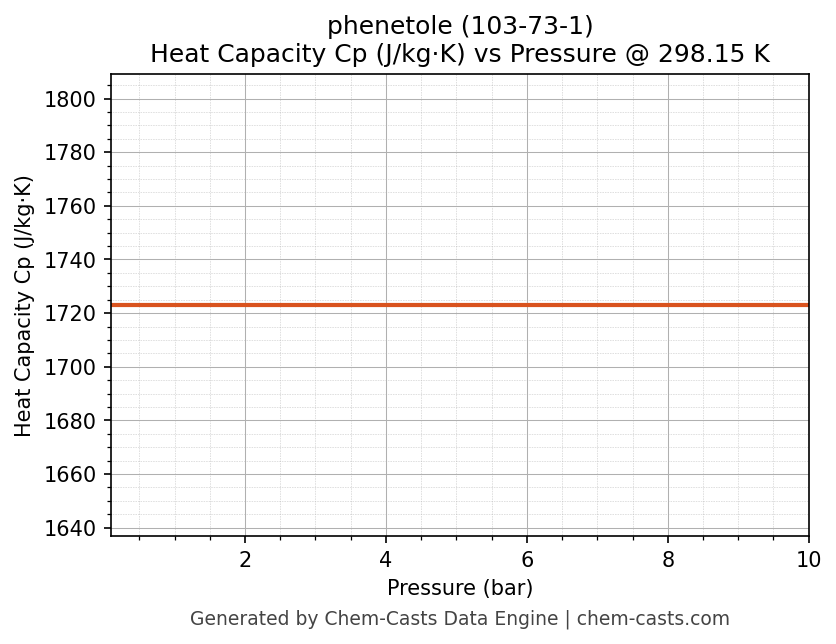 This page presents the pressure-dependent thermodynamic and transport properties of phenetole (CAS 103-73-1) calculated at a constant temperature of 298 K (25 °C) over the pressure range 0.10-10 bar.