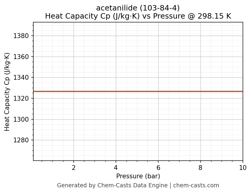 This page presents the pressure-dependent thermodynamic and transport properties of acetanilide (CAS 103-84-4) calculated at a constant temperature of 298 K (25 °C) over the pressure range 0.10-10 bar.