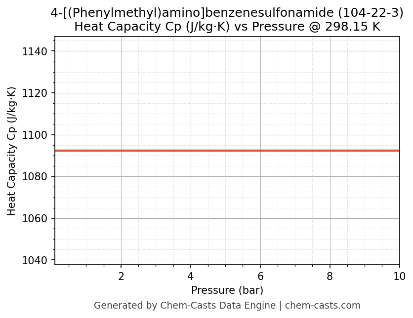 This page presents the pressure-dependent thermodynamic and transport properties of 4-[(Phenylmethyl)amino]benzenesulfonamide (CAS 104-22-3) calculated at a constant temperature of 298 K (25 °C) over the pressure range 0.10-10 bar.