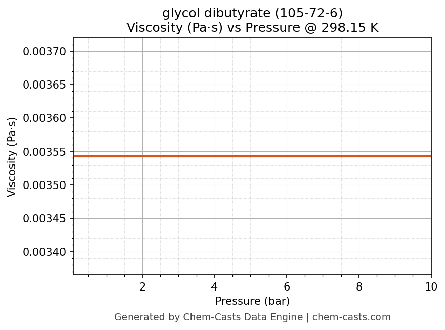 This page presents the pressure-dependent thermodynamic and transport properties of glycol dibutyrate (CAS 105-72-6) calculated at a constant temperature of 298 K (25 °C) over the pressure range 0.10-10 bar.