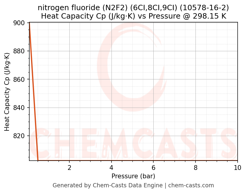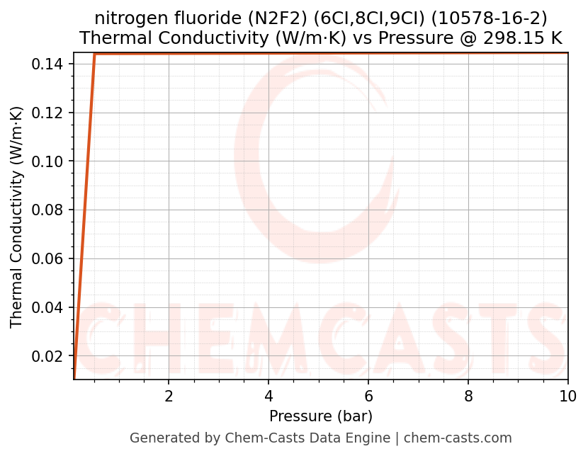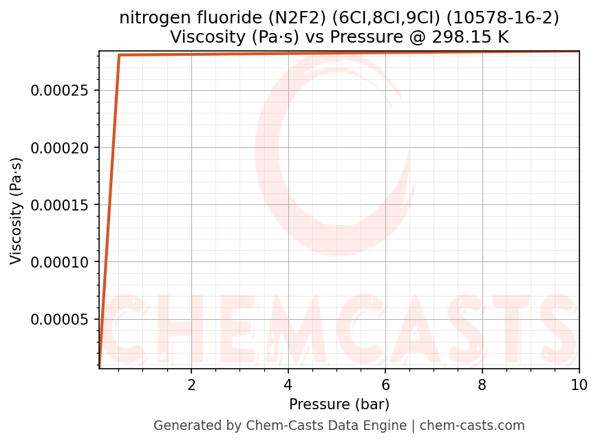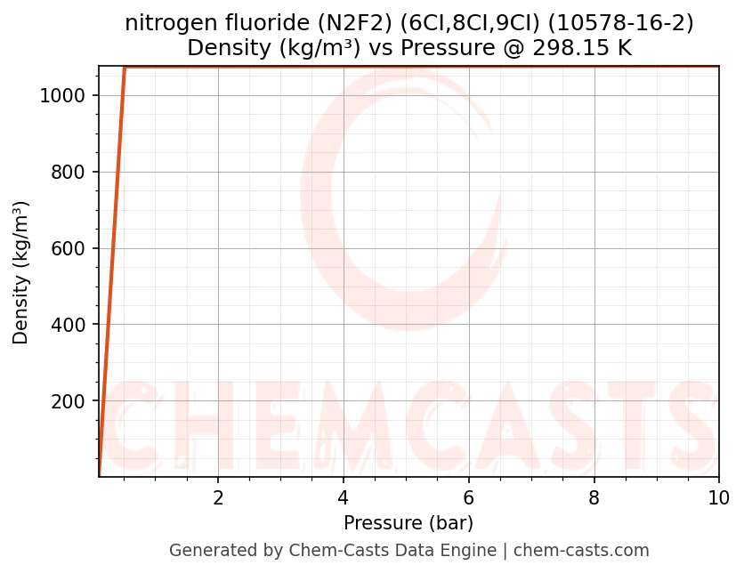 This page presents the pressure-dependent thermodynamic and transport properties of nitrogen fluoride (N2F2) (6CI,8CI,9CI) (CAS 10578-16-2) calculated at a constant temperature of 298 K (25 °C) over the pressure range 0.10-10 bar.