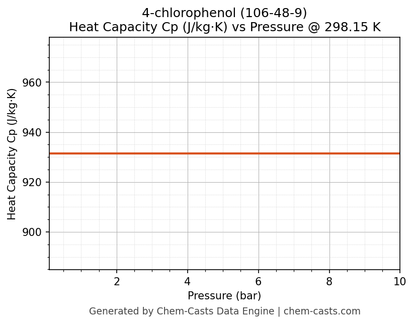 This page presents the pressure-dependent thermodynamic and transport properties of 4-chlorophenol (CAS 106-48-9) calculated at a constant temperature of 298 K (25 °C) over the pressure range 0.10-10 bar.