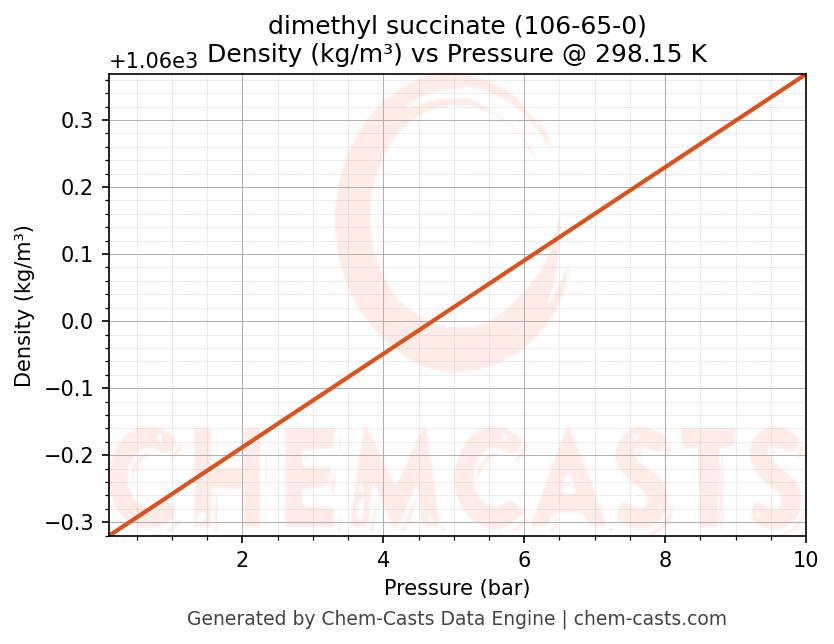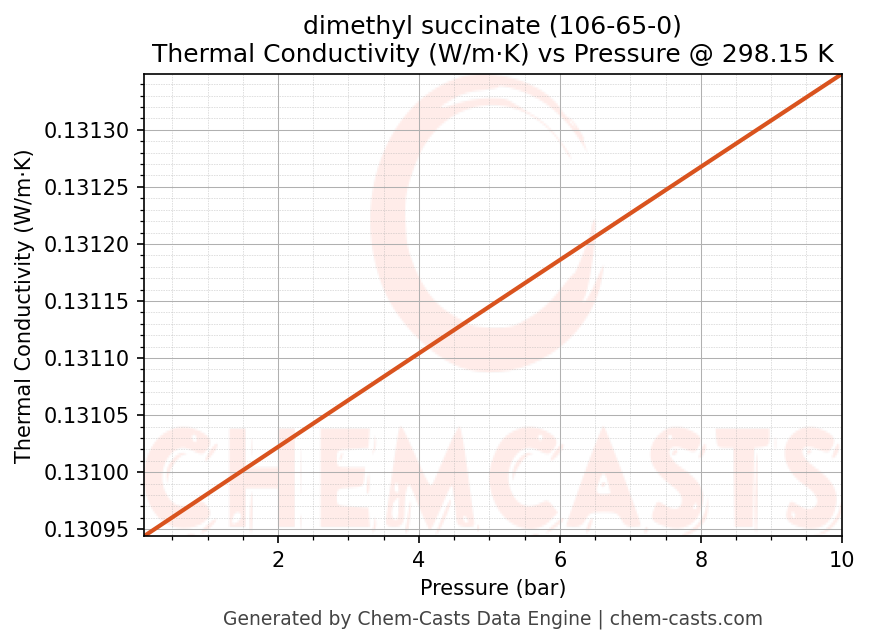 This page presents the pressure-dependent thermodynamic and transport properties of dimethyl succinate (CAS 106-65-0) calculated at a constant temperature of 298 K (25 °C) over the pressure range 0.10-10 bar.