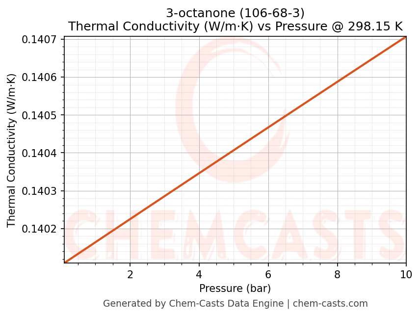 This page presents the pressure-dependent thermodynamic and transport properties of 3-octanone (CAS 106-68-3) calculated at a constant temperature of 298 K (25 °C) over the pressure range 0.10-10 bar.