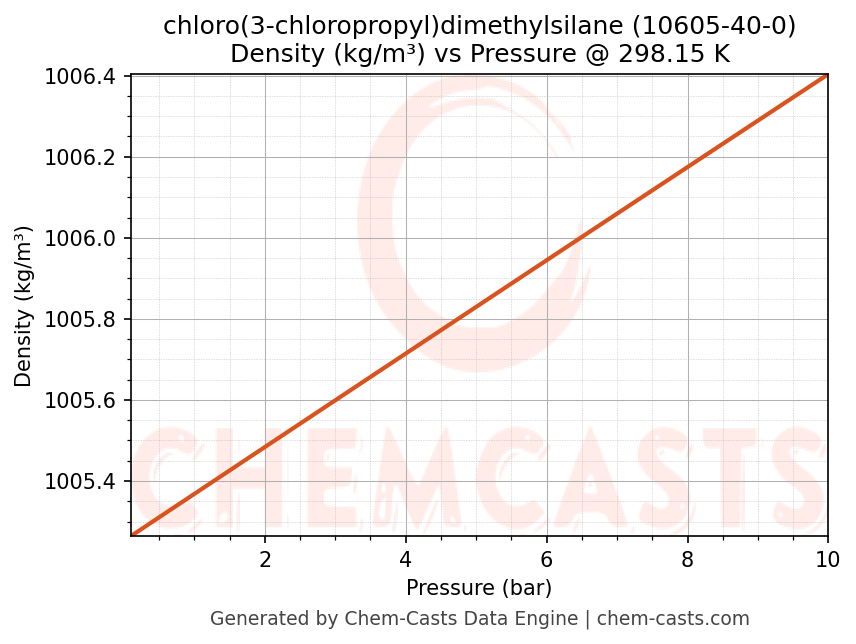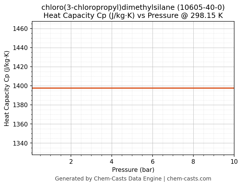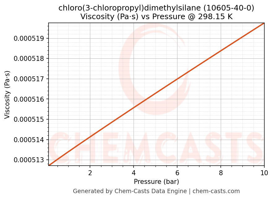 This page presents the pressure-dependent thermodynamic and transport properties of chloro(3-chloropropyl)dimethylsilane (CAS 10605-40-0) calculated at a constant temperature of 298 K (25 °C) over the pressure range 0.10-10 bar.