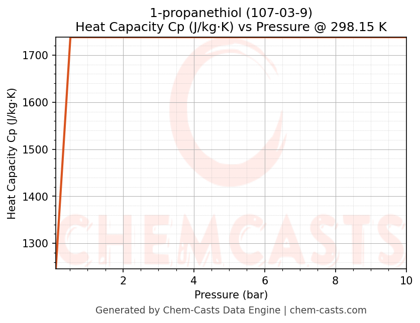 This page presents the pressure-dependent thermodynamic and transport properties of 1-propanethiol (CAS 107-03-9) calculated at a constant temperature of 298 K (25 °C) over the pressure range 0.10-10 bar.