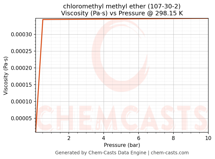 This page presents the pressure-dependent thermodynamic and transport properties of chloromethyl methyl ether (CAS 107-30-2) calculated at a constant temperature of 298 K (25 °C) over the pressure range 0.10-10 bar.