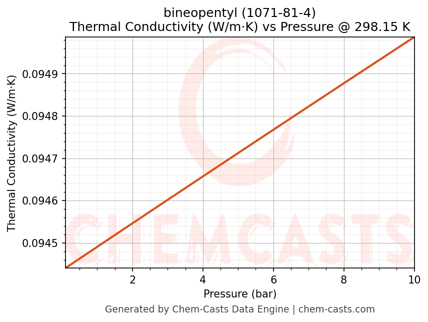 This page presents the pressure-dependent thermodynamic and transport properties of bineopentyl (CAS 1071-81-4) calculated at a constant temperature of 298 K (25 °C) over the pressure range 0.10-10 bar.