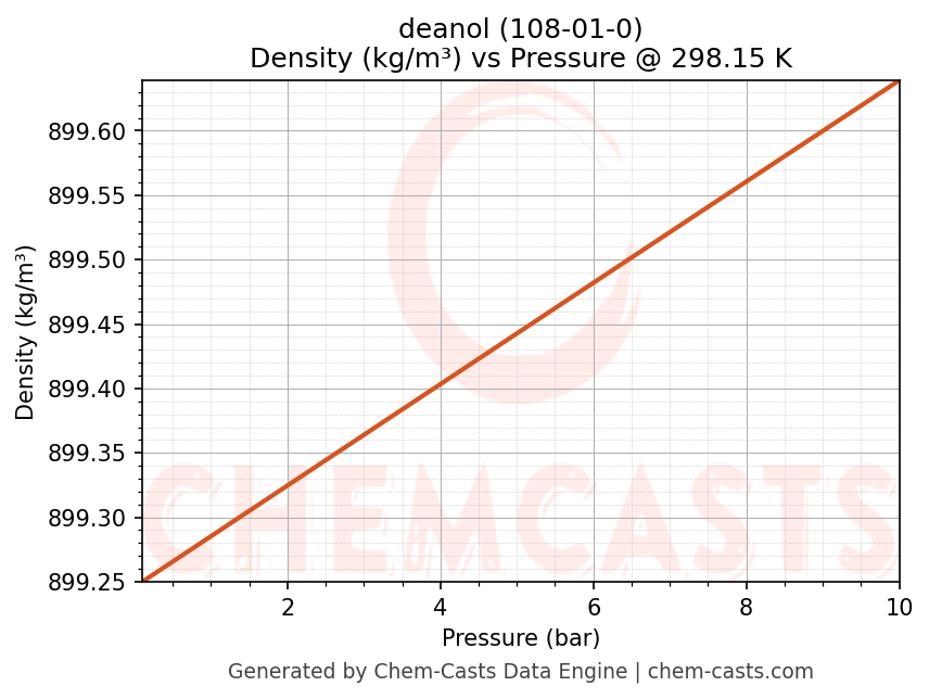 This page presents the pressure-dependent thermodynamic and transport properties of deanol (CAS 108-01-0) calculated at a constant temperature of 298 K (25 °C) over the pressure range 0.10-10 bar.