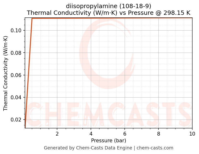 This page presents the pressure-dependent thermodynamic and transport properties of diisopropylamine (CAS 108-18-9) calculated at a constant temperature of 298 K (25 °C) over the pressure range 0.10-10 bar.