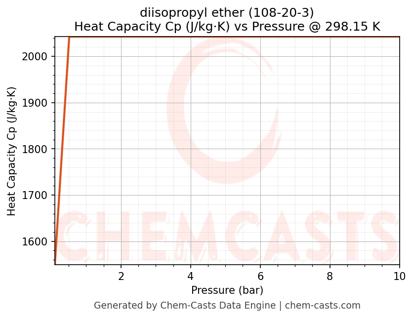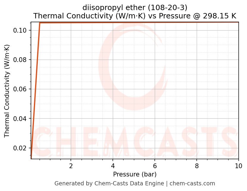 This page presents the pressure-dependent thermodynamic and transport properties of diisopropyl ether (CAS 108-20-3) calculated at a constant temperature of 298 K (25 °C) over the pressure range 0.10-10 bar.