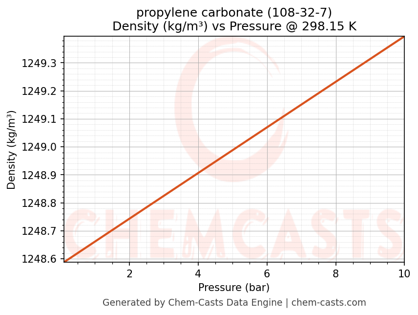 This page presents the pressure-dependent thermodynamic and transport properties of propylene carbonate (CAS 108-32-7) calculated at a constant temperature of 298 K (25 °C) over the pressure range 0.10-10 bar.